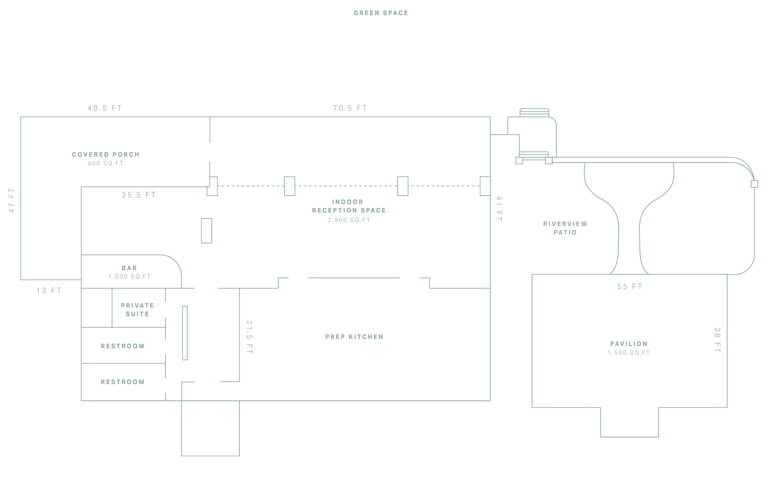 Stone River also boasts two charming outdoor spaces for guests to enjoy: a wrap-around porch overlooking the Greenway and a covered pavilion equipped with ceiling fans, cafe lights, and recessed lighting, perfect for both comfort and elegance.